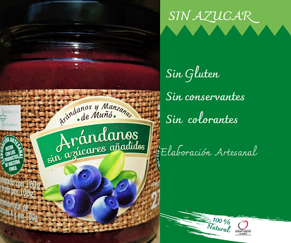Elaborado artesanalmente, es 100% natural, sin colorantes ni conservantes y sin gluten. Producto asturiano hecho exclusivamente con los arándanos y manzanas de nuestra finca, en envase de cristal de 500 ó 250ml (no envasamos en plástico).