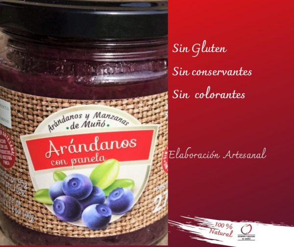 Arándanos y Manzana con panela: 95% Fruta (62% Manzana- 33% Arándanos)-5% Panela.(azúcar moreno integral resultado de calentar y evaporar jugo de caña de azúcar por métodos tradicionales, producto orgánico de origen 100% natural).