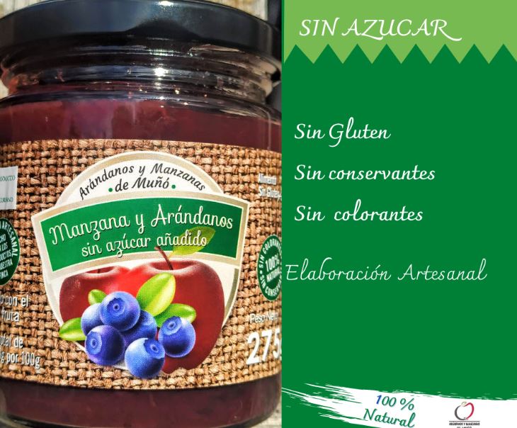 Elaborada artesanalmente, es 100% natural, sin colorantes ni conservantes y sin gluten. Producto asturiano hecho exclusivamente con los arándanos y las manzanas de nuestra finca, en envase de cristal de 275 gr (no envasamos en plástico).